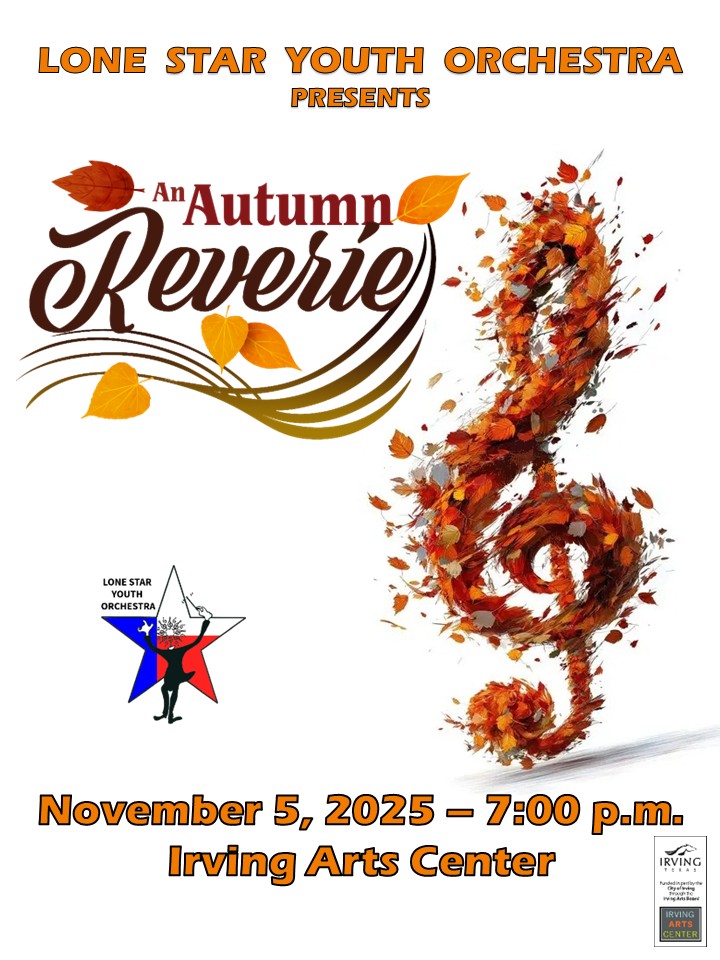 “An Autumn Reverie” will take place on Wednesday, November 5, 2025, at 7:00 p.m. at the Irving Arts Center’s Carpenter Hall. The Arts Center address is 3333 N. MacArthur Blvd., Irving, TX 75062. Please be aware of road construction along MacArthur Blvd. and allow for extra travel time.